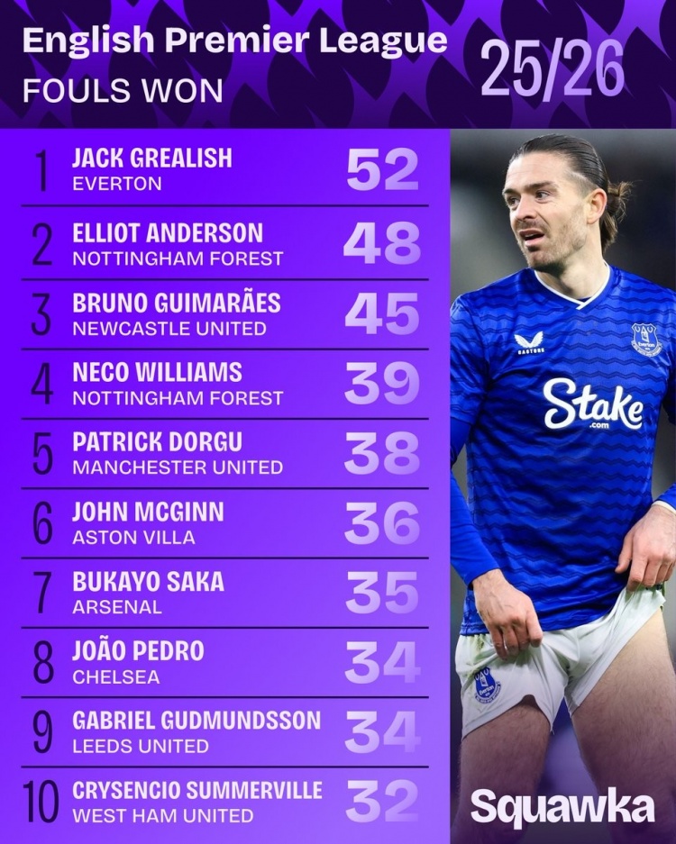 1月10日讯 数据机构squawka统计了本赛季英超的造犯规情况,格拉利什居首。