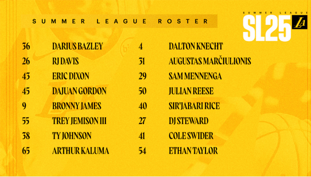 湖人的夏季联赛名单里共有中锋1人(特雷-杰米森三世)、前锋6人(达里厄斯-贝兹利、埃里克-迪克逊、亚瑟-卡卢马、萨姆-门宁加、朱利安-里斯、科尔-斯威德、)、后卫除开布朗尼和克内克特,还有7人(RJ-戴维斯、达胡安-戈登、泰-约翰逊、奥古斯塔斯-马修利奥尼斯、塞拉巴里-莱斯、DJ-斯图沃特、伊桑-泰勒)。由湖人助教比由-莱夫斯克和林赛-哈丁执教。