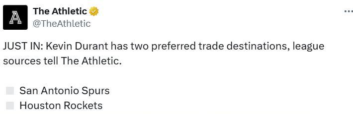 TA:杜兰特已明确两个心仪的下家,就是马刺和火箭