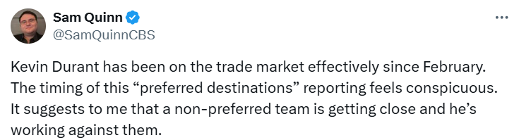 对此,据NBA记者Sam Quinn发文写道:“杜兰特实际上从2月起就处于交易市场上。这次‘心仪下家’报道的时机显得引人注目。在我看来,这意味着某支非心仪球队正接近达成交易,而他在对此采取应对行动。”