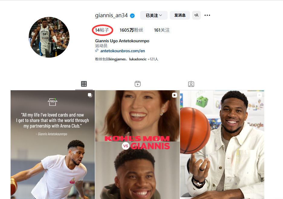 目前字母哥的IG账号仅剩下14条帖子,其中前四条均为广告或商业合作内容。不过他仍保留了雄鹿2021年NBA总决赛夺冠以及上赛季赢得NBA杯的相关照片。